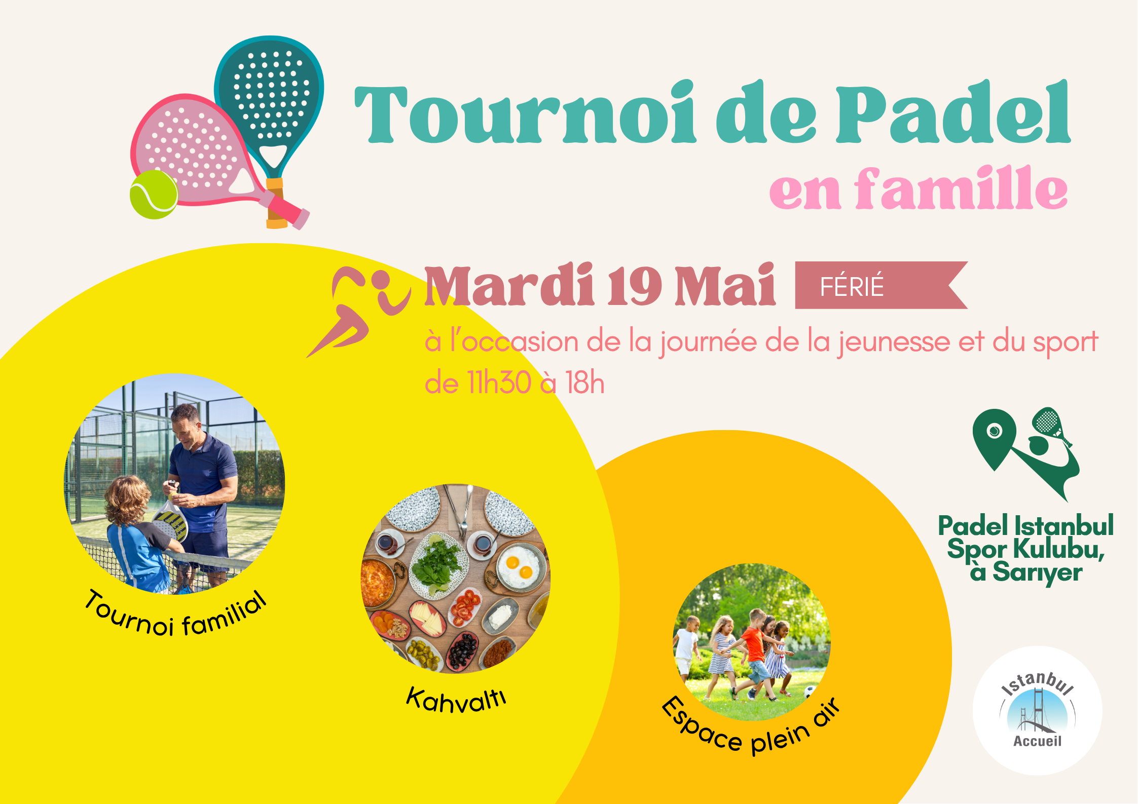 Home Events Journée Padel en famille ! Journée Padel en famille ! Réservé à nos membres Istanbul AccueilPour en découvrir plus sur cet événement et vous y inscrire, connectez-vous avec vos identifiants. Vous pouvez également consulter notre dernière newsletter. + Ajouter à mon Agenda Google + iCal / Outlook export 00 jours 00 heures 00 minutes 00 secondes Date 19 Mai 2026 Heure 11:30 AM Catégorie Evenements Partagez cet événement